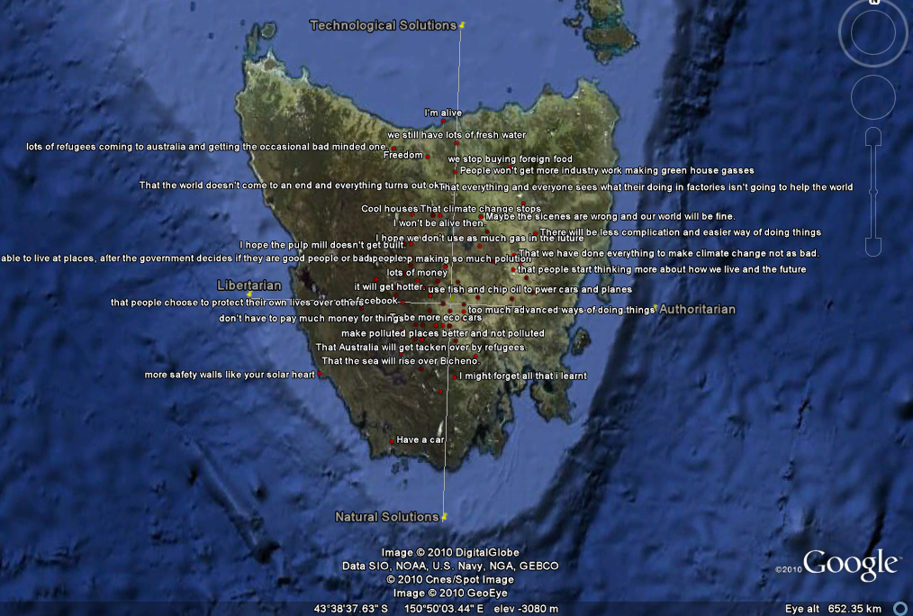 For the AMDF project, we’ve built a virtual future Tasmania. It’s a Google Earth-based data visualisation of what young Tasmanians think about tackling climate change in 80 years time. For each of the 100 year 5/6 students who completed our education kit and survey, we’ve built them a virtual future city. The x and y position of the city, plus its layout and composition, tell us what kind of future they want to live in.